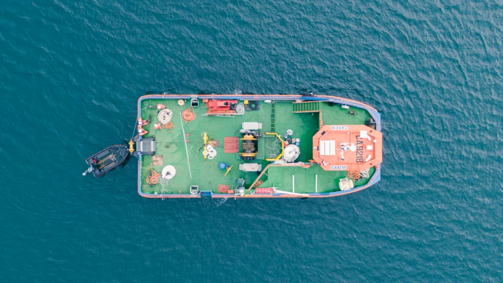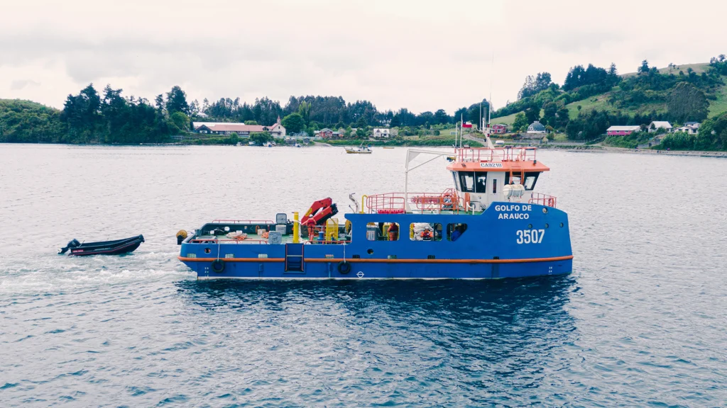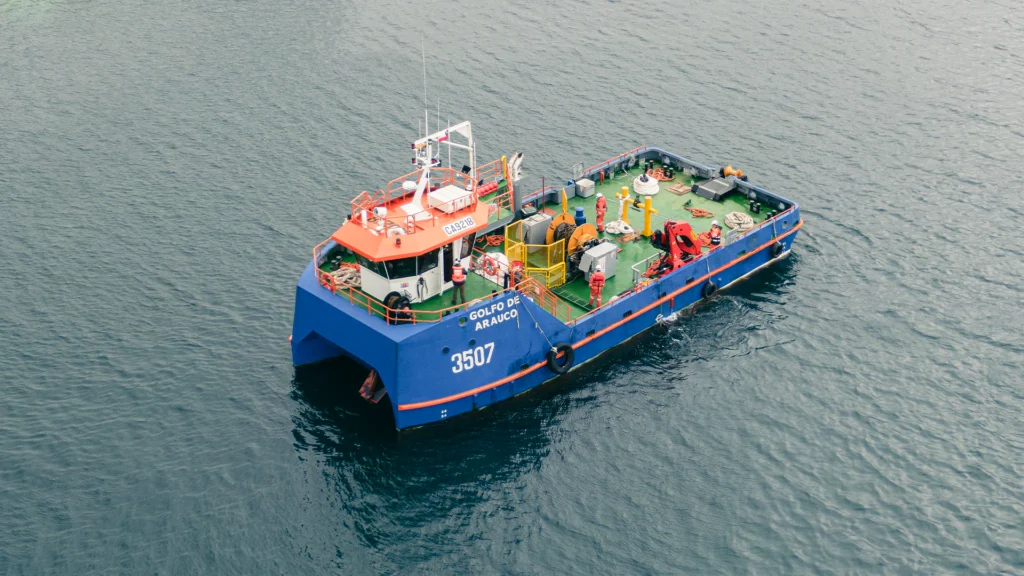 Nave menor fondeo con capacidad de carga de 100 tons, actualmente utilizada para apoyar centros de cultivo, instalación y recambio de mallas peceras y loberas. Posicionamiento POSAT.